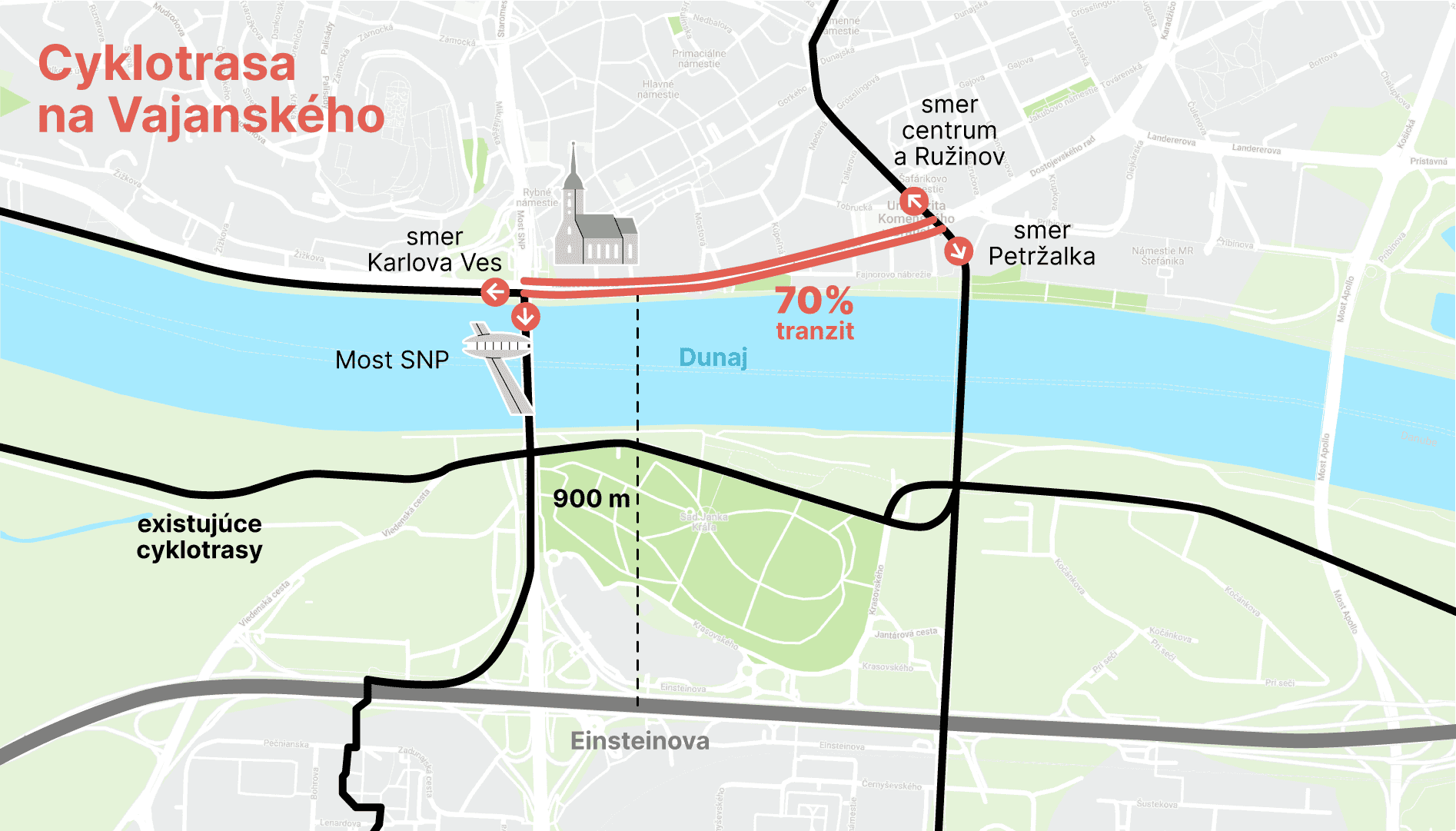 Cyklotrasa tu práveže nebola. Vyznačená cykloinfraštruktúra v smere od Karlovej Vsi, v podobe zmiešaného cyklochodníka, končí pri moste SNP. Odtiaľ nasleduje už len frekventovaný chodník pre peších. Nové cyklopruhy na Vajanského a Rázusovom nábreží priamo a bezpečne prepájajú cyklistickú infraštruktúru v smere z Karlovej Vsi do centra mesta s ďalším pokračovaním na Ružinov a Nové Mesto a tiež prípojnú cyklistickú infraštruktúru do Petržalky a ďalej v smere toku Dunaja.