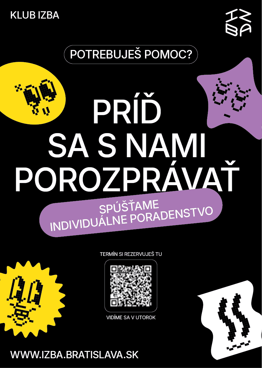 IZBA je miesto pre teba! Na Obchodnej 29 sme vytvorili bezpečný priestor, kde sa môžeš obrátiť na odbornú pomoc úplne anonymne a bezplatne. Či už potrebuješ individuálne poradenstvo, alebo sa chceš zapojiť do skupinových diskusií na rôzne témy, sme tu pre teba.